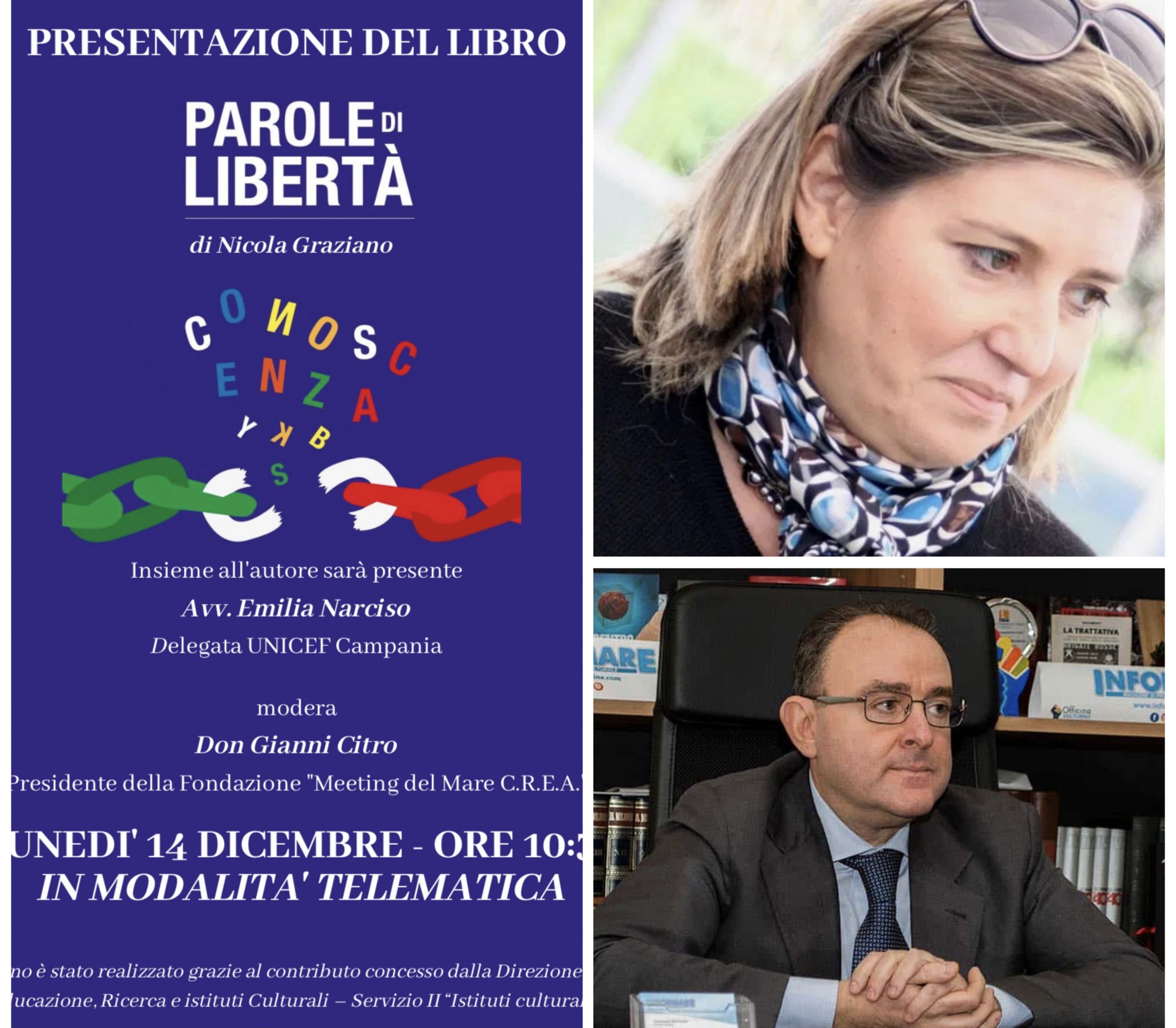 Considerata l’impossibilità di tenere presentazioni dei testi dal vivo, Lunedì 14 dicembre alle ore 10.30 in modalità telematica ci sarà la presentazione del libro “  PAROLE DI LIBERTÀ “ del magistrato Nicola Graziano. È un romanzo rivolto a tutti i giovani che frequentano la scuola secondaria. L’intento dell’autore è quello di tracciare un percorso semplice di educazione civica in cui i giovani lettori scoprono i valori della Costituzione Italiana. Modera l’incontro Don Gianni Citro. Come relatore l’avvocato Emilia narciso delegata UNICEF Campania la quale spiega che ben 1500 sono state le adesioni al webinar e tanta voglia dei giovani di esserci per una riflessione sulla Carta Costituzionale scritta da un magistrato Nicola Graziano che coniuga quotidianamente il diritto con l’umanità.  Il magistrato spiega ,  “ Perché noi? “ Perché partecipare ad un incontro sulla Costituzione attraverso le sue parole più significative?  Oggi poi, alla vigilia del Natale e con tutti i problemi legati alla Scuola in DAD o in Presenza! La risposta è proprio in questo  piccolo libro, un manuale di come vivere insieme in comunità . Cosa è la libertà, cosa è la solidarietà, cosa è la dignità, cosa la è la responsabilità, cosa è la conoscenza, cosa è l’istruzione? Ne parleremo insieme.  Vi aspettiamo cari alunni con la gioia e la responsabilità di sempre il 14 dicembre alle ore 10.30 Parole di Libertà del magistrato Nicola Graziano. La parola ora è REGISTRATEVI per farlo basta inviare una mail a fondazionemeetingdelmarecrea@gmail.com