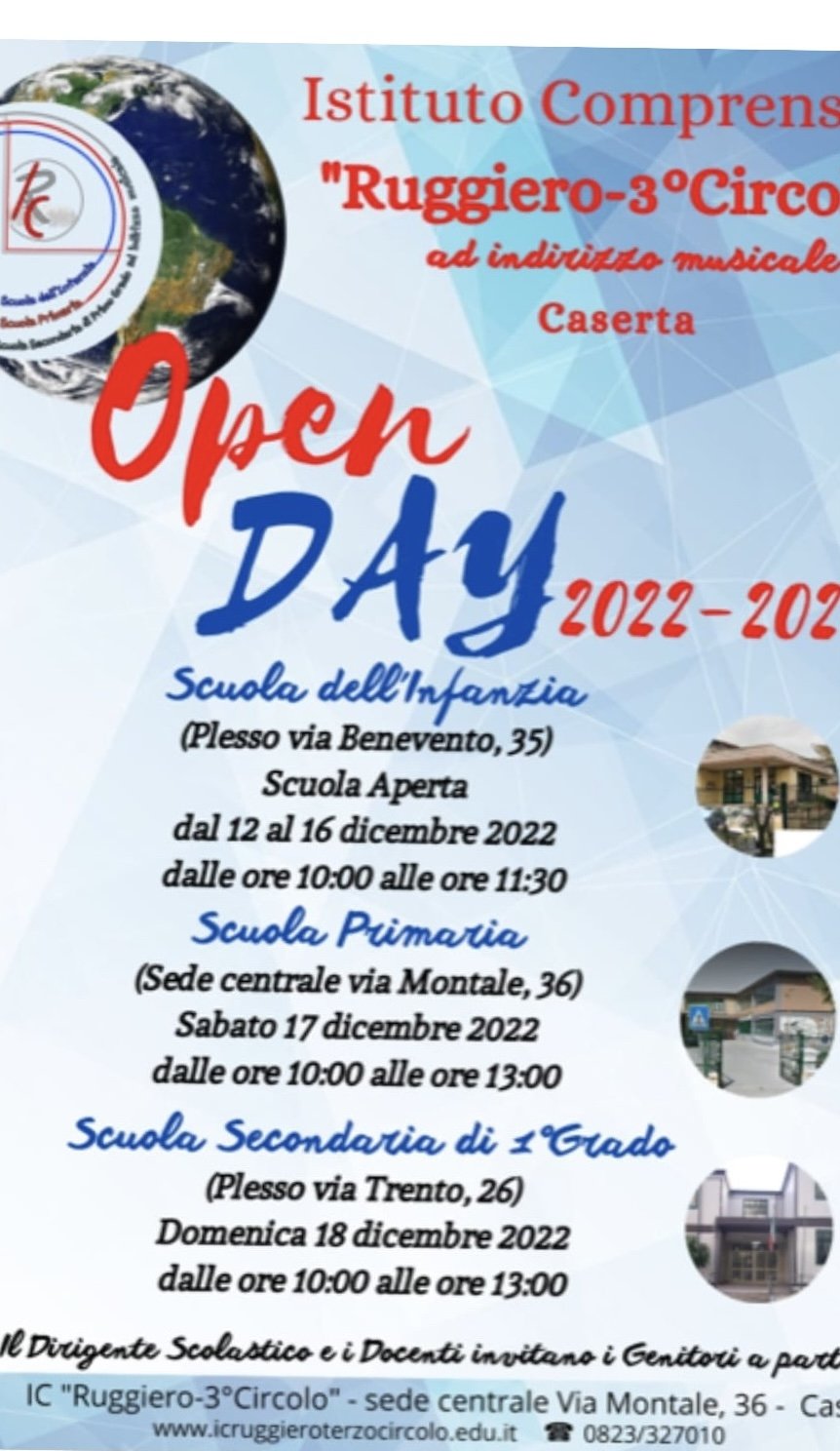 Caserta. L’Istituto Comprensivo ” Ruggiero III Circolo” apre l’ Open Day 2022.2023. Il Dirigente Scolastico e i Docenti invitano i genitori a partecipare a quella che sarà una vera e propria festa dedicata all’ accoglienza .