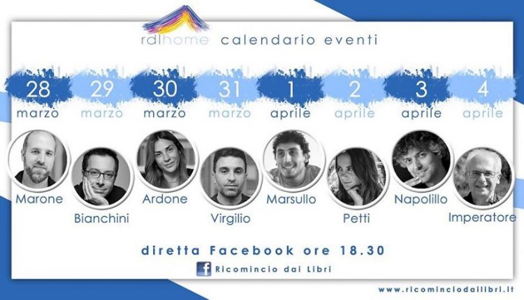 NAPOLI – L’esordio è stato apprezzato, tanto più che la presentazione di “Ricomincio dai libri Home”, è stata condotta con grande seguito di fan, direttamente dal direttore artistico dell’iniziativa, lo scrittore Lorenzo Marone. Un approccio semplice, eppure pieno di energia positiva, che il pubblico di Marone, ma anche di appassionati addetti ai lavori nonché di lettori e amanti dei libri in generale, ha apprezzato e apprezzerà mentre si resta a casa, per i prossimi appuntamenti in programma on line da oggi alle ore 18.30 e fino alla fine della quarantena, il cui programma per ora è fino al 4 aprile, da seguire collegandosi alla pagina facebook Ricomincio dai Libri.