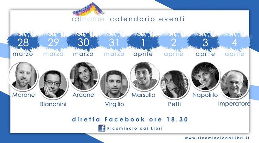 D’altro canto, quante volte può capitare di entrare a casa dello scrittore preferito? questa è sicuramente l’occasione, per condividere anche con la propria presenza, fatta di domande o emoticon, un momento che ha la forza di tenere tutti distanti ma al contempo uniti, come in queste serate con gli autori in diretta, ecco i primi in programma: il 29 marzo Luca Bianchini, il 30 marzo Viola Ardone, il 31 marzo Massimiliano Virgilio, l’1 aprile Marco Marsullo, il 2 aprile Lavinia Petti, il 3 aprile Enzo Gianmaria Napolillo, e il 4 aprile Pino Imperatore.