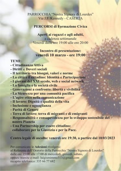 La progettualità civica parte dall’Oratorio della Parrocchia di “Nostra Signora di Lourdes”, in via J.F.Kennedy a Caserta. Il giovane Direttore dell’Oratorio Luigi Smimmo, insieme a Don Antonello Giannotti, promotori lungimiranti di questa iniziativa sociale e civica, hanno scelto e sostenuto la Referente del Corso, che ha sperimentato nel tempo e in varie luoghi educativi le competenze civiche utili per tale offerta formativa.