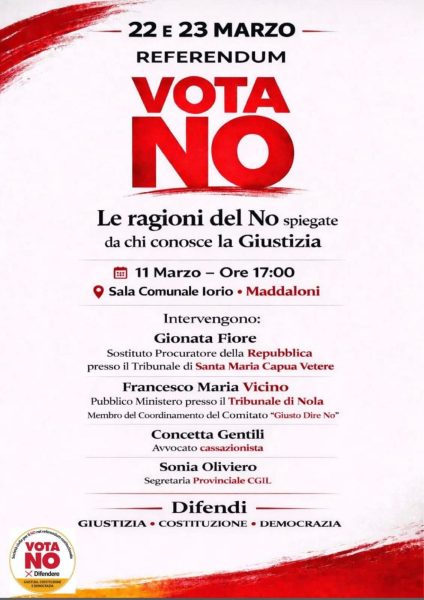 Il referendum sulla giustizia del 22 e 23 marzo è un passaggio che merita attenzione e consapevolezza, non reazioni istintive. Le ragioni del NO, che saranno illustrate l’11 marzo nella Sala Comunale Iorio di Maddaloni, non nascono da appartenenze politiche ma dall’esperienza concreta di chi opera ogni giorno dentro il sistema giudiziario e ne conosce equilibri, limiti e fragilità.