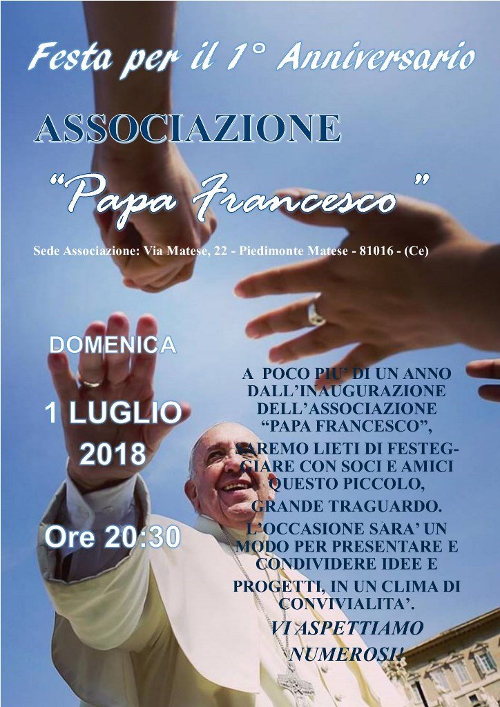 PIEDIMONTE MATESE – Domenica 1 luglio 2018, con inizio alle ore 20.30, presso la sede di Via Matese n. 22 in Piedimonte Matese, a poco più di un anno dalla sua inaugurazione, l’Associazione culturale no-profit “Papa Francesco”, è lieta di festeggiare con tutti i soci ed amici questo piccolo, grande traguardo. L’occasione sarà un modo per presentare e condividere idee e progetti, in un clima di convivialità. L’associazione Papa Francesco, di cui è Presidente Anna Zulla, nasce il 25 gennaio 2017
