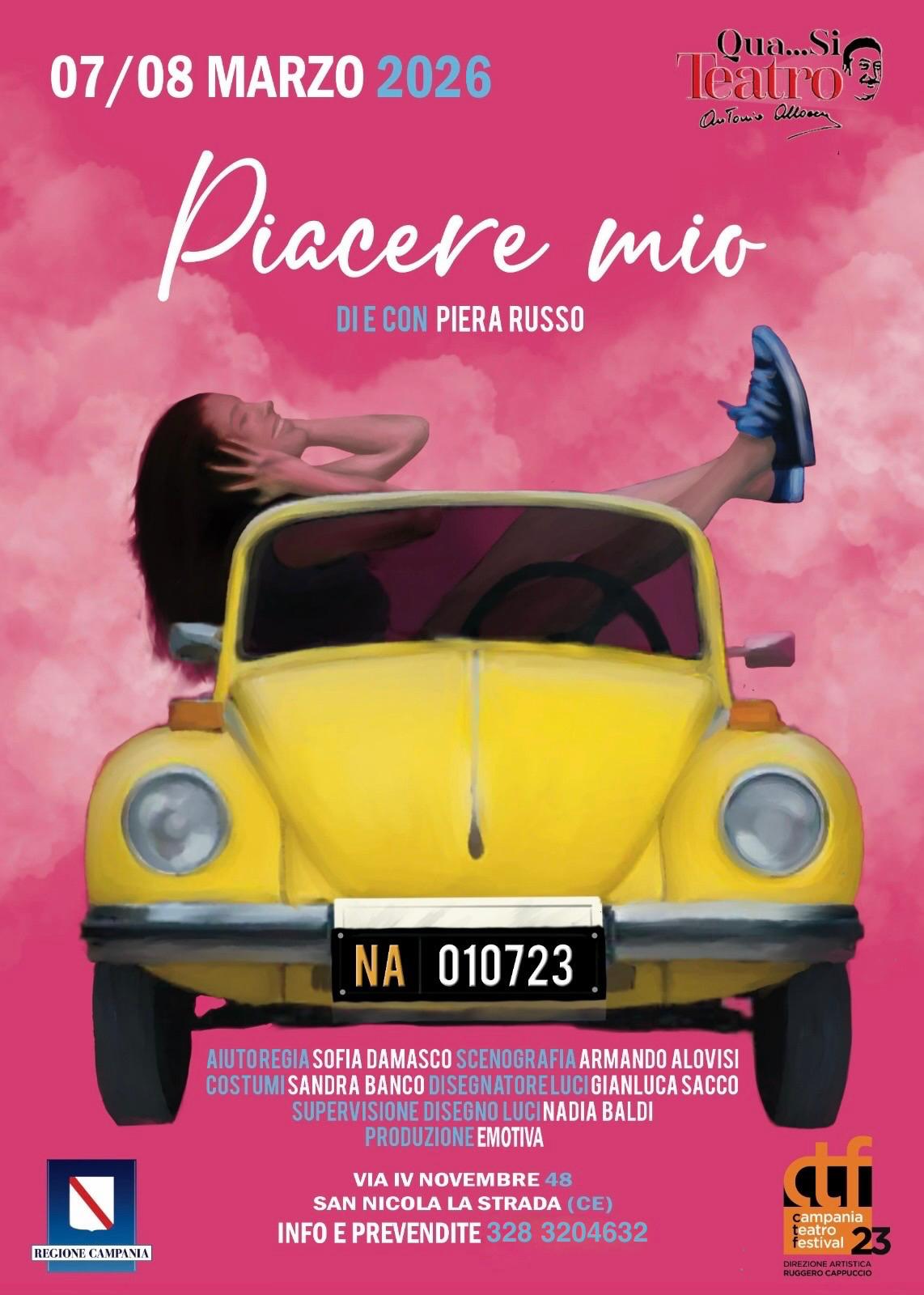 San Nicola la Strada – Sabato 7 marzo e domenica 8 marzo il Qua…si Teatro Antonio Allocca celebra la Giornata della Donna con uno spettacolo speciale: arriva “Piacere mio”, monologo tragicomico scritto, diretto e interpretato da Piera Russo e prodotto da Emotiva.