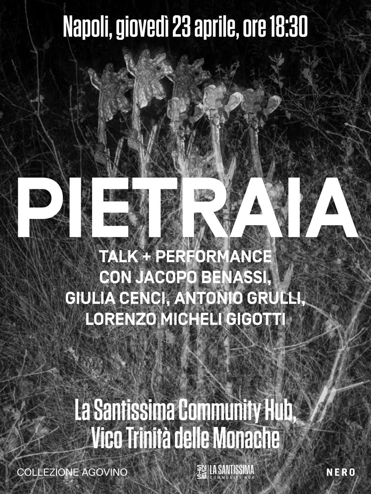 In collaborazione con Collezione Agovino, NERO e la Santissima Community Hub, giovedì 23 aprile, si è tenuta la presentazione del libro Pietraia, moderata da Lorenzo Micheli Gigotti, NERO Editions, con la partecipazione degli artisti Giulia Cenci e Jacopo Benassi, e del curatore Antonio Grulli.