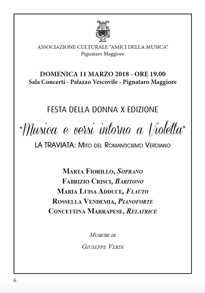 L’Associazione “Amici della Musica”, infatti, celebra la X Edizione della Festa della Donna portando in scena ” Musica e Versi intorno a Violetta ” nell’evento “La Traviata : mito del Romanticismo Verdiano” che si svolgera’ domenica 11 marzo 2018 alle ore 19.00 nella Sala Concerti del Palazzo Vescovile di Pignataro Maggiore.