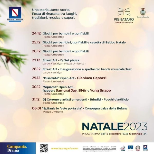 La giunta comunale di Pignataro Maggiore ha pubblicato il programma completo degli eventi natalizi. A dare inizio ai festeggiamenti sarà, come da tradizione, l’accensione dell’albero in Piazza Umberto I con la presenza di diversi artisti di strada. A fare da sfondo ci sarà il Baccalà Village con la presenza di Enrico Porzio e Salvatore Lionello. Il 20 dicembre per onorare la “giornata della gentilezza” con un torneo di calcio femminile nello Stadio comunale di Monteoliveto. In ambito musicale i responsabili hanno scelto di avvicinare i giovani invitando cantanti come: Gabriele Esposito, Gianluca Capozzi, SamuraiJai, Bl4ir e Yang Snapp. Ci saranno anche diversi gruppi e dj emergenti. Il 24, 25 e 26 sono le giornate dedicate ai bambini con giochi gonfiabili e casetta di Babbo Natale. Il 31 ci sarà, come di consueto, il brindisi di fine anno con spettacolo pirotecnico. Il 6 di gennaio si saluteranno le festività con la consegna della calza a tutti i bambini.