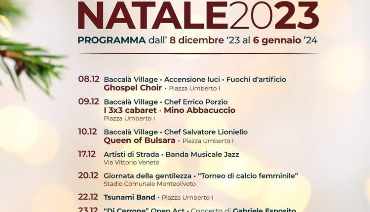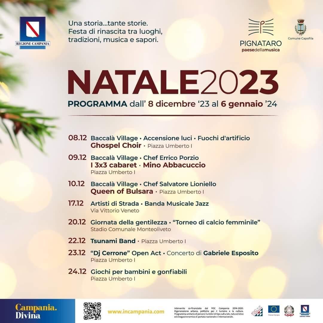 La giunta comunale di Pignataro Maggiore ha pubblicato il programma completo degli eventi natalizi. A dare inizio ai festeggiamenti sarà, come da tradizione, l’accensione dell’albero in Piazza Umberto I con la presenza di diversi artisti di strada. A fare da sfondo ci sarà il Baccalà Village con la presenza di Enrico Porzio e Salvatore Lionello. Il 20 dicembre per onorare la “giornata della gentilezza” con un torneo di calcio femminile nello Stadio comunale di Monteoliveto. In ambito musicale i responsabili hanno scelto di avvicinare i giovani invitando cantanti come: Gabriele Esposito, Gianluca Capozzi, SamuraiJai, Bl4ir e Yang Snapp. Ci saranno anche diversi gruppi e dj emergenti. Il 24, 25 e 26 sono le giornate dedicate ai bambini con giochi gonfiabili e casetta di Babbo Natale. Il 31 ci sarà, come di consueto, il brindisi di fine anno con spettacolo pirotecnico. Il 6 di gennaio si saluteranno le festività con la consegna della calza a tutti i bambini.