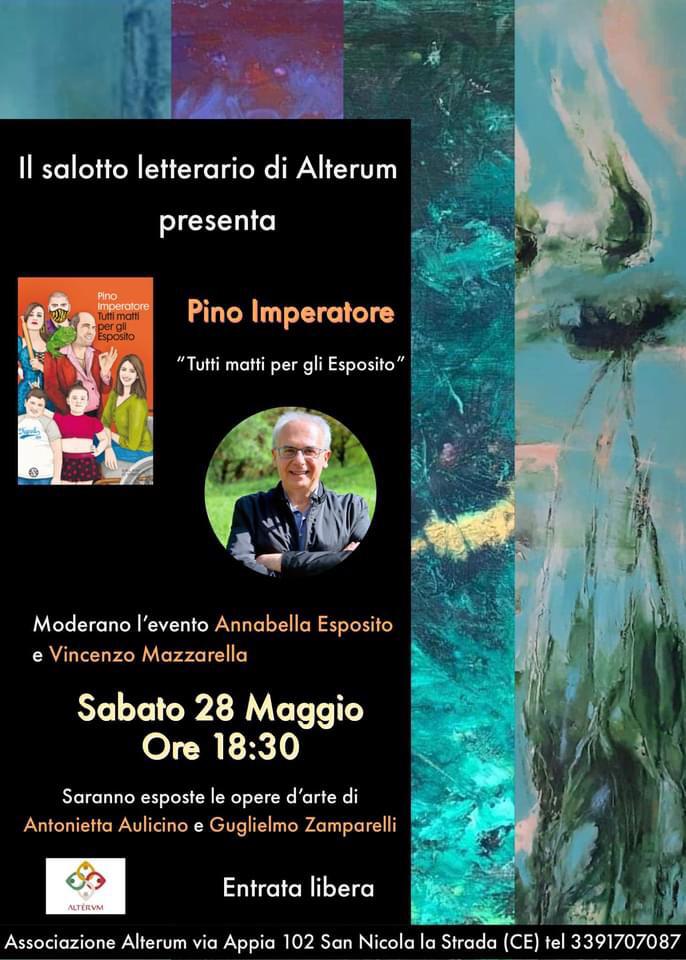 L’associazione Alterum ospiterà, sabato 28 maggio alle 18:30, presso la sede di via Appia 102 di San Nicola la Strada, lo scrittore Pino Imperatore che presenterà “Tutti matti per gli Esposito” il nuovo capitolo della saga degli Esposito, una variegata famiglia napoletana ~che vive nel quartiere Sanità.
