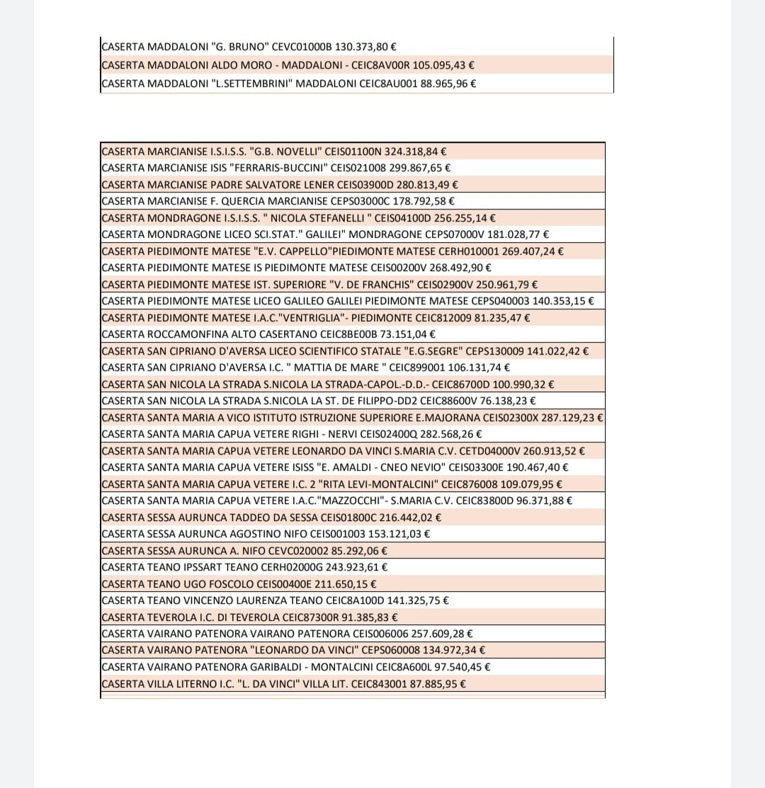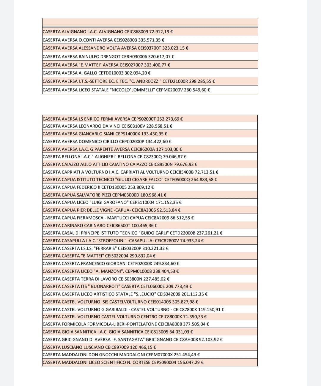 Ecco la tabella delle risorse destinate alle scuole della Provincia di Caserta.