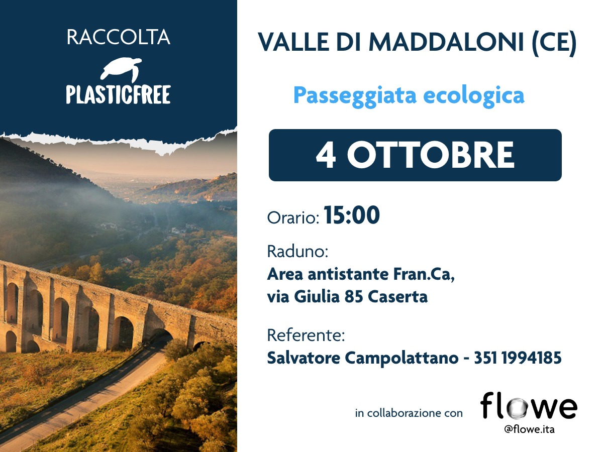 Domenica 4 ottobre i volontari di Plastic Free della regione Campania tornano sulla collina del santuario seguendo un percorso che arriverà fino ai Ponti della Valle, ripulendo dalla plastica tutto il percorso. Tre comuni interessati: Maddaloni, Caserta e Valle di Maddaloni. Una passeggiata ecologica, immersi nel verde e nelle bellezze del nostro patrimonio, che sono però circondati da tanta plastica e rifiuti che deturpano la nostra ricchezza.