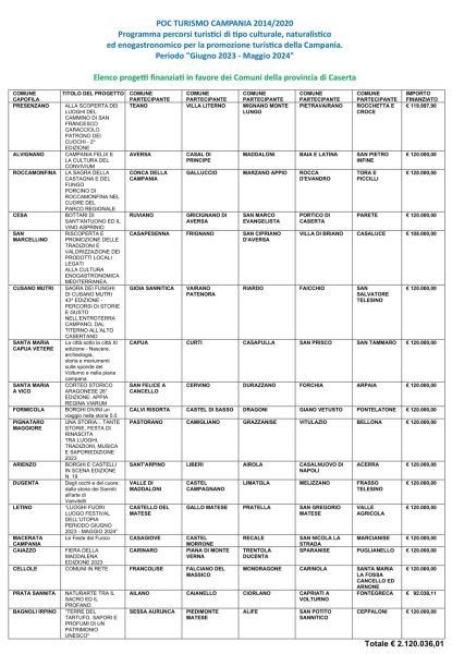 “Approvati e finanziati dalla Regione Campania i 94 progetti presentati da altrettanti Comuni della provincia di Caserta per la realizzazione di percorsi turistici di tipo culturale, naturalistico ed enogastronomico, nell’ambito del ‘POC Turismo Campania 2014/2020′ .