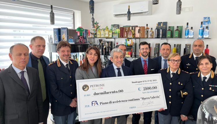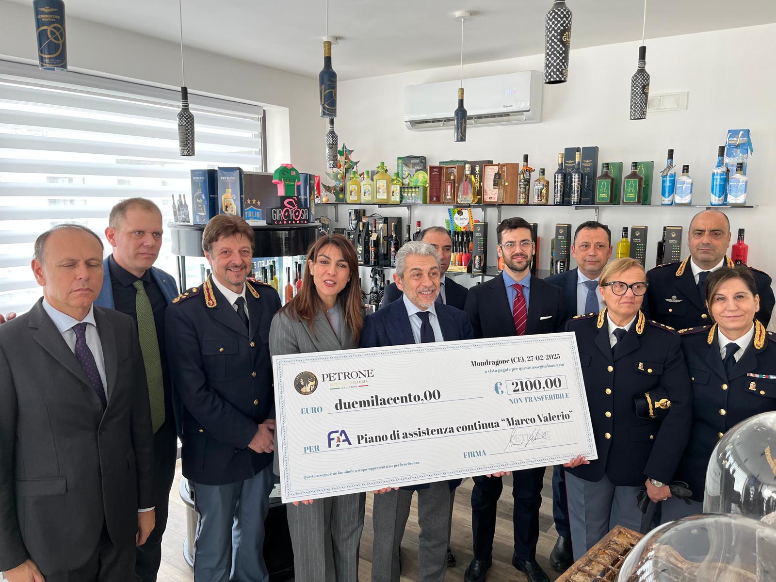 Stamattina, presso la sede dell’Antica distilleria “Petrone” di Mondragone, alla presenza del Questore di Caserta, Andrea Grassi, è stato consegnato, al rappresentante del Fondo assistenza della Polizia di Stato, un assegno contenete la somma ricavata dall’iniziativa di beneficenza abbinata alla vendita dei boxes natalizi a marchio Polizia. L’importo verrà devoluto a beneficio del “Piano Marco Valerio”, rivolto ai figli degli appartenenti alla Polizia di Stato, minori degli anni 18, affetti da patologie ad andamento cronico.