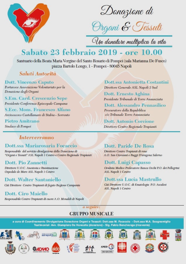 POMPEI – Nonostante la temperatura polare che ha caratterizzato la giornata di sabato 23 febbraio 2019, non c’era più un solo posto a sedere negli 800 disponibili, nella bellissima Sala, all’interno del Santuario della Beata Maria Vergine del Santo Rosario di Pompei. Il simposio ha voluto promuovere la cultura della donazione degli organi, tessuti e cellule. La Campagna di sensibilizzazione è stata fortemente voluta dalla Dott.ssa Mariarosaria Focaccio, Responsabile del servizio divulgazione della Donazione di “Organi e Tessuti” ASL Napoli 1 Centro e Centro Regionale Trapianti.