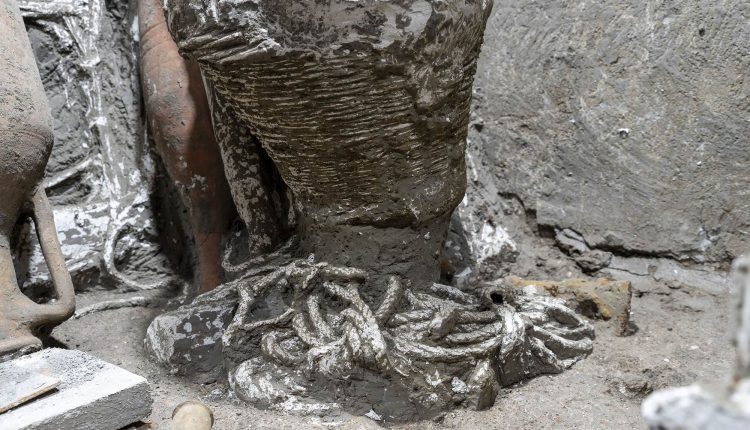 È l’ultima scoperta nel quartiere servile della villa di Civita Giuliana, indagata scientificamente sin dal 2017 quando fu strappata agli scavatori clandestini grazie a un accordo tra il Parco Archeologico di Pompei e la Procura della Repubblica di Torre Annunziata: un ambiente, conservato in maniera eccezionale come gli altri due scoperti nello stesso settore con i letti degli schiavi, dove è stato possibile realizzare i calchi di mobili e altri oggetti di materiali deperibili: legno, tessuti, corde. con la realizzazione dei primi calchi delle vittime dell’eruzione del Vesuvio nel 79 d.C., è unica al mondo in quanto frutto della dinamica specifica dell’evento catastrofico: persone o oggetti travolti e coperti dalla “corrente piroclastica”, una nube ardente di cenere e gas tossici, sono rimasti lì per secoli. Ma mentre la cenere si è solidificata, formando uno strato molto solido noto come “cinerite”, il materiale organico quali corpi umani, animali o oggetti lignei, si sono decomposti, lasciando un vuoto nel terreno. Questi vuoti possono essere riempiti di gesso durante lo scavo, per riottenere, dall’impronta in “negativo”, la forma originale. Una tecnica che ha portato a risultati straordinari nella villa di Civita Giuliana, dai calchi di due vittime e di un cavallo a quelli dei letti modesti del quartiere servile.