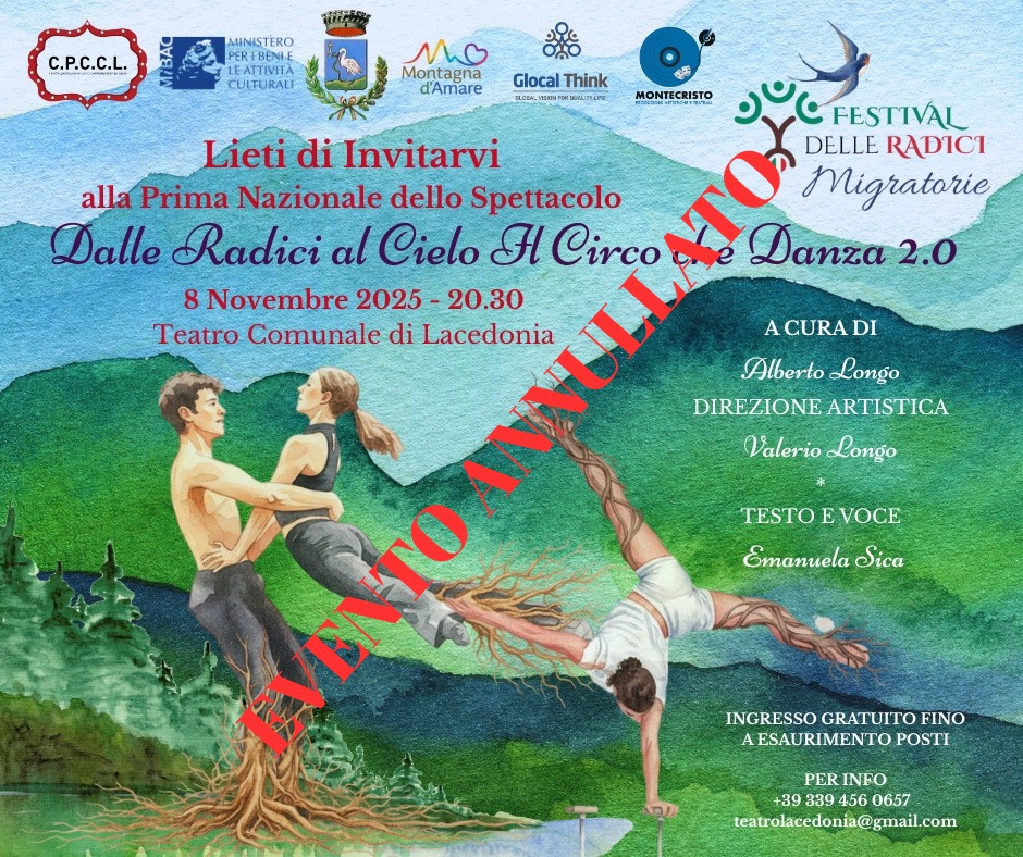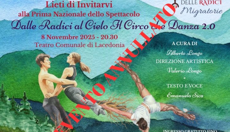 Dopo gli eventi sismici verificasi in Irpinia, l’organizzazione dello spettacolo “Dalle Radici al Cielo – Il Circo che Danza 2.0”, previsto per l’8 Novembre 2025, presso il teatro di Lacedonia, ha annullato l’evento posticipandolo a data da destinarsi. Dall’organizzazione riceviamo e pubblichiamo: “Per senso di responsabilità e rispetto verso il grande lavoro che in queste ore stanno svolgendo sul territorio Sindaci e Amministrazioni, Protezione Civile, Prefettura, forze dell’ordine, scuole, associazioni e volontari, lo spettacolo “Dalle Radici al Cielo – Il Circo che Danza 2.0” previsto a Lacedonia è posticipato a data da destinarsi.