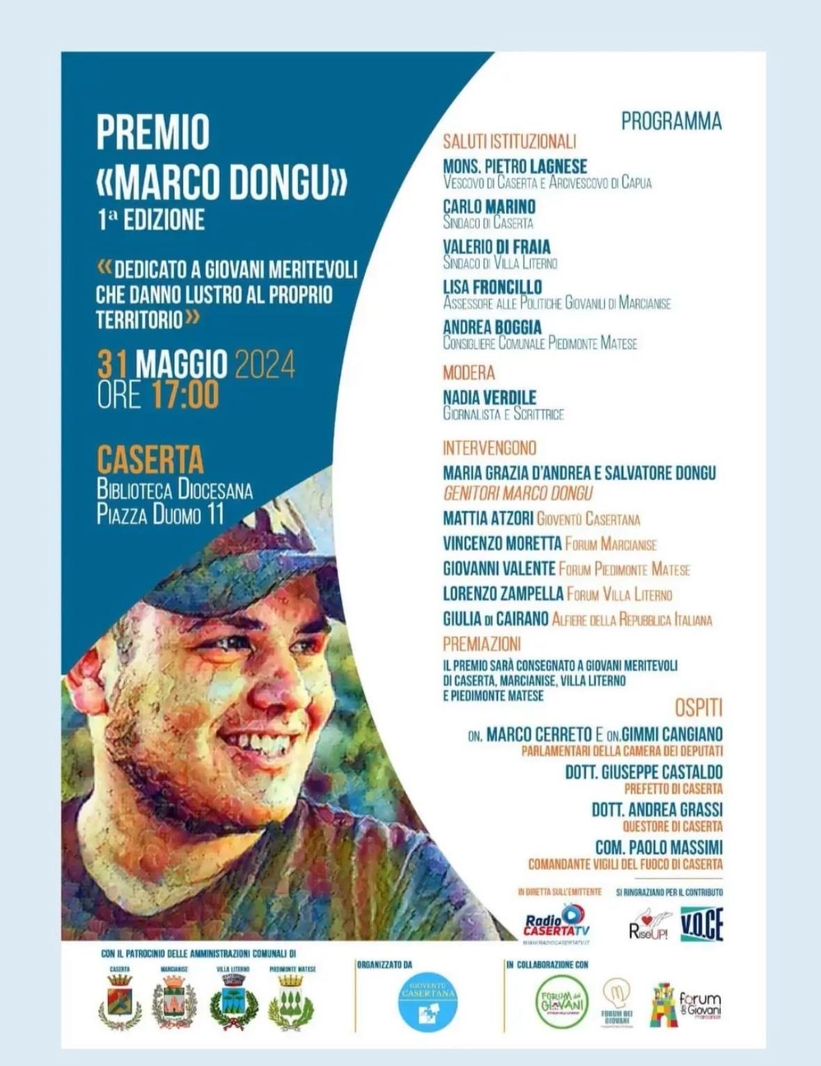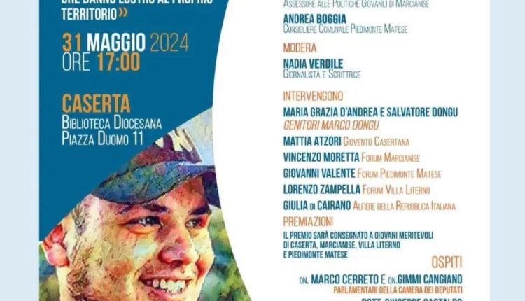 Oggi pomeriggio, alle 17.30, all’interno della Biblioteca Diocesana in piazza Duomo, si è tenuta la prima edizione del “Premio Marco Dongu” dedicato ai giovani meritevoli del nostro territorio, fortemente voluto dalla Consigliera del Forum dei giovani di Caserta, Valentina Russo.