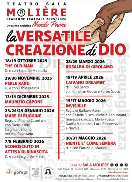 Andrà sotto il titolo de “La versatile creazione di Dio” la quindicesima stagione 2025/2026 del Teatro Sala Molière di Pozzuoli (ArtGarage – Via Bognar 21) diretto da Nando Paone. Il nuovo claim è ispirato al titolo di una commedia di Cetty Sommella che, raccontando tutte quelle realtà messe ai margini dalla società, intendeva sottolineare la bellezza e il valore della versatilità. Alla conferenza di presentazione erano presenti il direttore artistico Nando Paone, la direttrice organizzativa Veronica Grossi, il critico cinematografico Giuseppe Borrone e il regista e sceneggiatore Carlo Luglio. Insieme a loro sono intervenuti alcuni dei protagonisti in cartellone come Fabio Brescia, Sergio Del Prete, Patrizia di Martino, Raffaele Parisi e Fulvio Sacco. Tutti gli altri hanno lasciato un video messaggio di presentazione del loro spettacolo che è stato proiettato nel corso della conferenza.