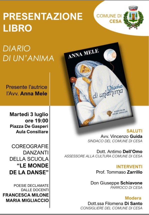 Sarà presentato martedì sera alle ore 19.00 nell’aula consiliare sita nella casa comunale di Piazza De Gasperi, il libro dell’avvocato Anna Mele “Diario di un’anima”.
