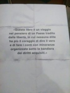 L’autore non si è sottratto al tam tam delle domande, necessario per lui accettare il cambiamento, per quanto riguarda i diritti negati sono paragonabili ad una cambiale in bianco, c’è chi lavora qua vicino per 0,50 € l’ora, si doveva affiancare al Jobs act il tetto del minimo salariale per tutelare di fatto i più danneggiati dal sistema, ossia i GIOVANI, la sfida tra ultimi e penultimi è una cosa inutile fine a sè stessa, manifestazione tipica di una guerra tra poveri che non ha senso, la storia la fanno gli errori, la cultura della promessa è andata ogni oltre immaginazione, esiste in politica anche la cultura dell’inciucio.