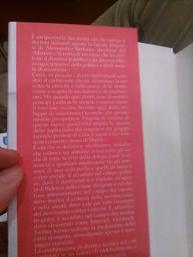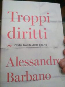 Interviene il prof. Cerchia, che definisce il libro ‘ complesso, snodo fondamentale delle vicende italiane, un processo di lungo periodo, non ci sono alternative agli imprenditori della rabbia, con l’abbandono della Banca d’Italia alla politica attuale monetaria in mano alla BCE, il libro analizza gli anni ’80 le risorse veicolate verso il nord, Maastricht, la deriva ideologica dei diritti che diventano tutt’altra cosa, una produzione illimitata di normative tra cui quelle europee ecc., l’incapacità delle istituzioni a dare risposte, la frantumazione del principio della delega, i troppi diritti che vengono visti come fonte di tradimento, il libro si legge è piacevole ma complesso, il titolo un po’ fuorviante si parla di eccesso di diritti in maniera impropria, bisogna capovolgere la storia per analizzarlo, i cambiamenti passano per gli accordi di Bretton Woods, la Guerra Fredda, la globalizzazione, le responsabilità della politica la visione ottimistica della sinistra sulla globalizzazione stessa, la qualità della nostra democrazia punto dolente’.