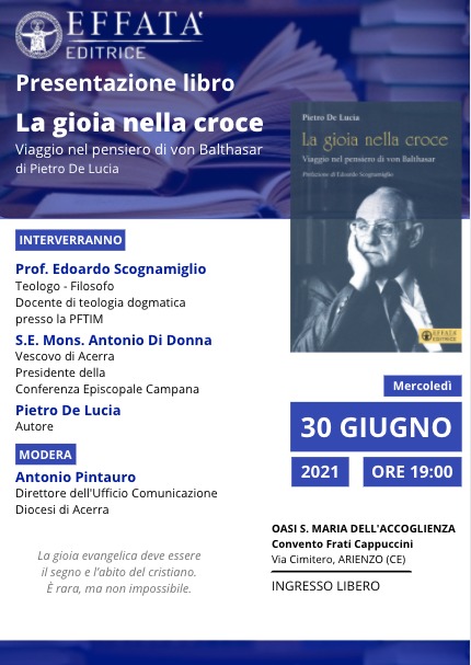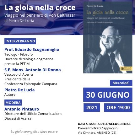 ARIENZO (Caserta) – Dopo gli opportuni preparativi è prossimo l’appuntamento di mercoledì 30 giugno 2021 allorquando dalle ore 19 presso l’Oasi di Santa Maria dell’Accoglienza de Convento dei Frati Cappuccini di Arienzo, in via Cimitero, la presentazione del libro “La gioia nella croce” rappresenta un Viaggio nel pensiero di von Balthasar, edito quest’anno nella Collana “Il respiro dell’anima” da Effatà Editrice (Torino). La partecipazione all’evento è con ingresso gratuito, salvo il rispetto delle indicazioni normative anti diffusione del covid-19.