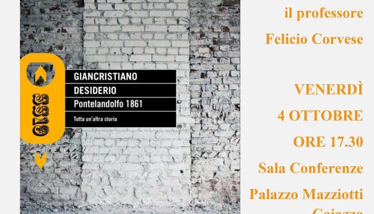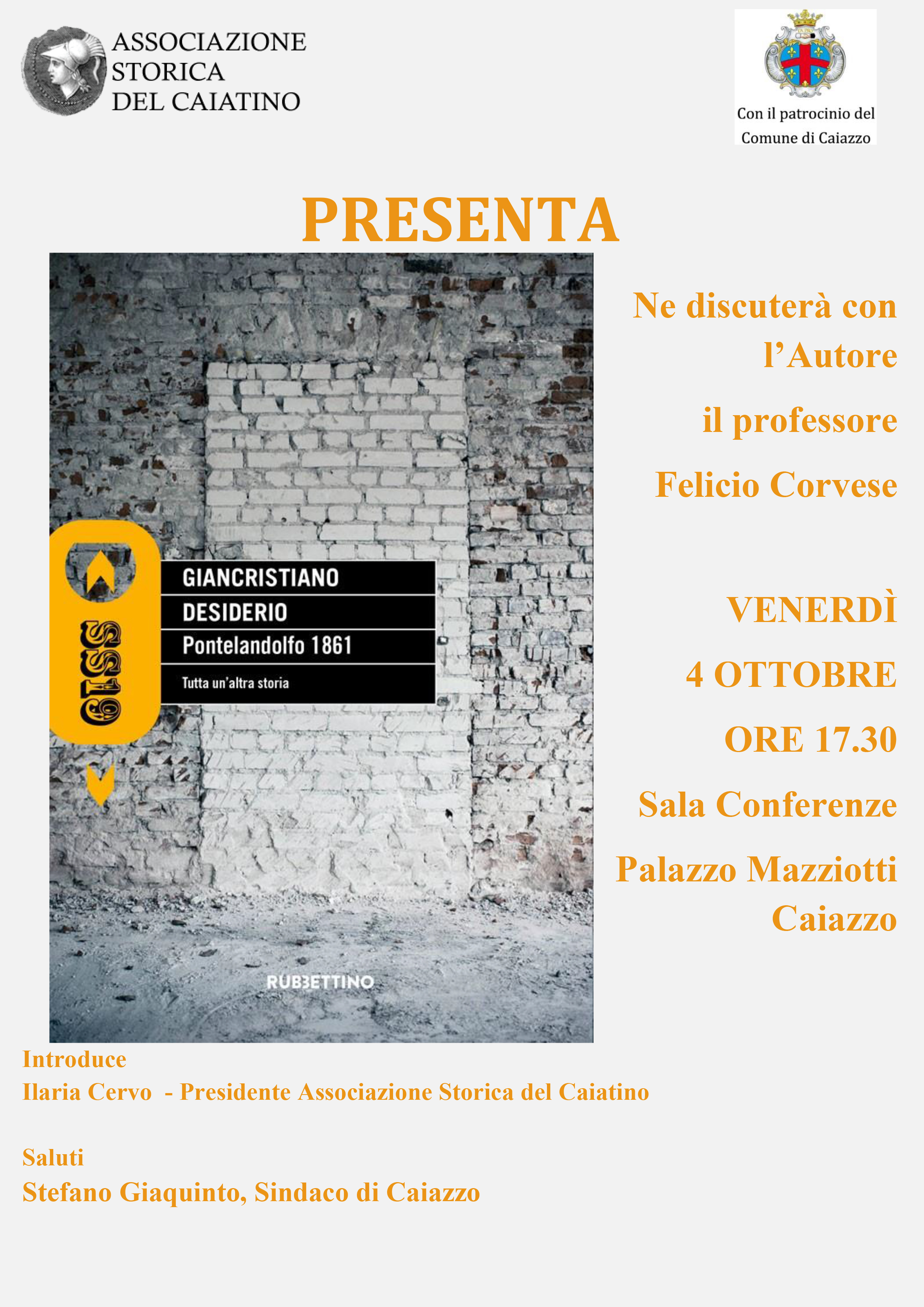 Venerdì 4 ottobre con inizio alle ore 17.30 nella Sala Conferenze dello storico Palazzo Mazziotti a Caiazzo sarà presentato il libro Pontelandolfo 1861. Tutta un’altra storia di Giancristiano Desiderio edito da Rubbettino, importantissima casa editrice meridionale, per la precisione calabrese.