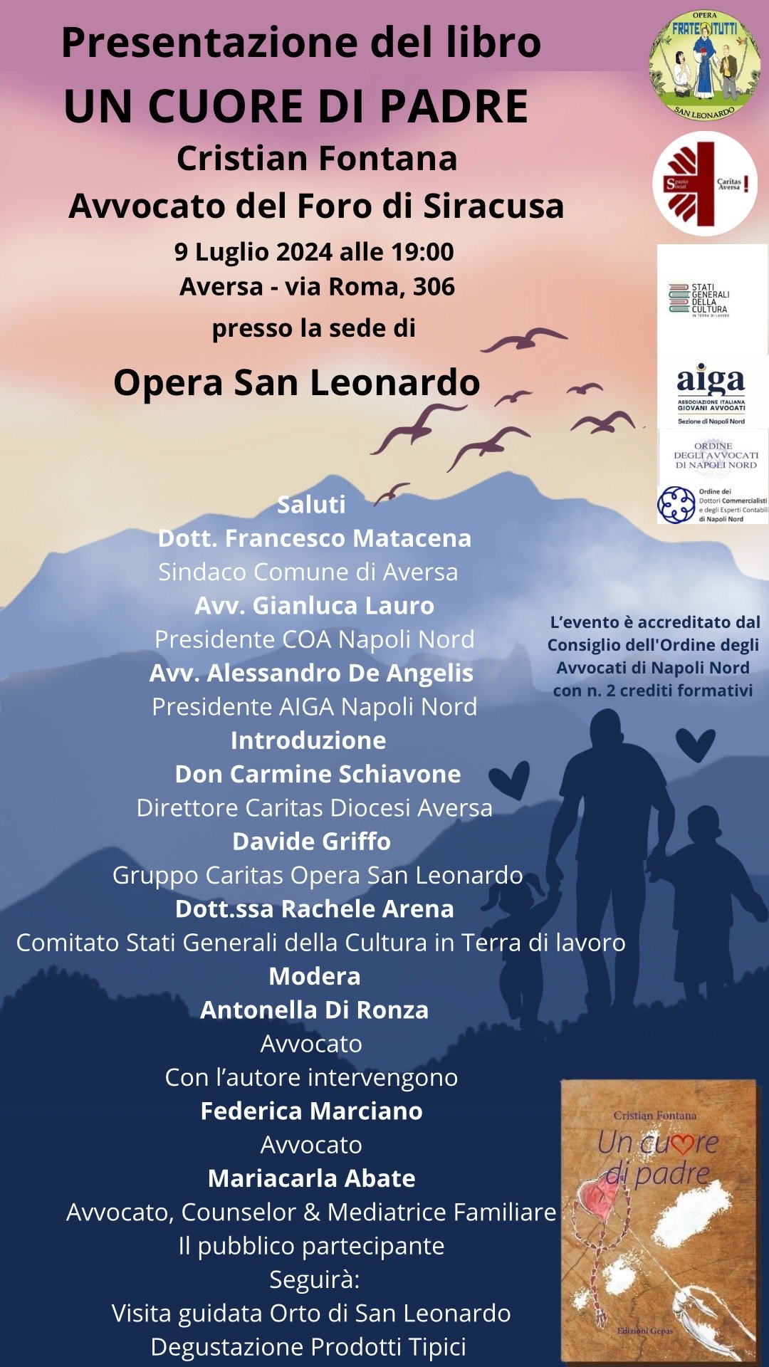 Il 9 luglio 2024, dalle ore 19:00, ad Aversa presso l’Opera San Leonardo della Caritas (adiacente Istituto Sagliano) sarà presentato il libro “Un cuore di padre” di Cristian Fontana, avvocato del Foro di Siracusa. Il libro affronta il difficile ruolo di essere genitori, in particolare di essere padre, alla luce dei cambiamenti che hanno investito la nostra società con un’attenzione anche al caso in cui i coniugi vivano la triste esperienza della separazione. Un padre esercita un modello educativo ed affettivo per i figli trasmettendo loro convinzioni e valori, fornisce protezione, infonde fiducia e sicurezza. Un buon padre quando serve deve sforzarsi anche di “contenere” i figli mostrando loro, non con autorità ma con un’autorevolezza necessaria, l’importanza e la priorità del rispetto delle regole e educandoli al rispetto per il prossimo. Per molti anni la figura del padre è stata svilita e messa in secondo piano nelle dinamiche familiari con conseguenze evidenti su molti ragazzi in termini di autostima e di difficili rapporti sociali.