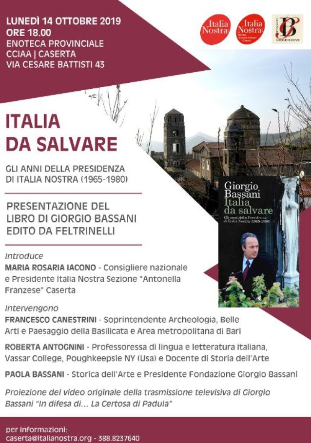 CASERTA – Lunedì, 14 ottobre 2019, presso la sede dell’ENOTECA provinciale CCIAA in Via Cesare Battisti nr. 48, con inizio alle ore 18:00, sarà presentato il libro “Italia da salvare” di Giorgio Bassani, edito da Feltrinelli.