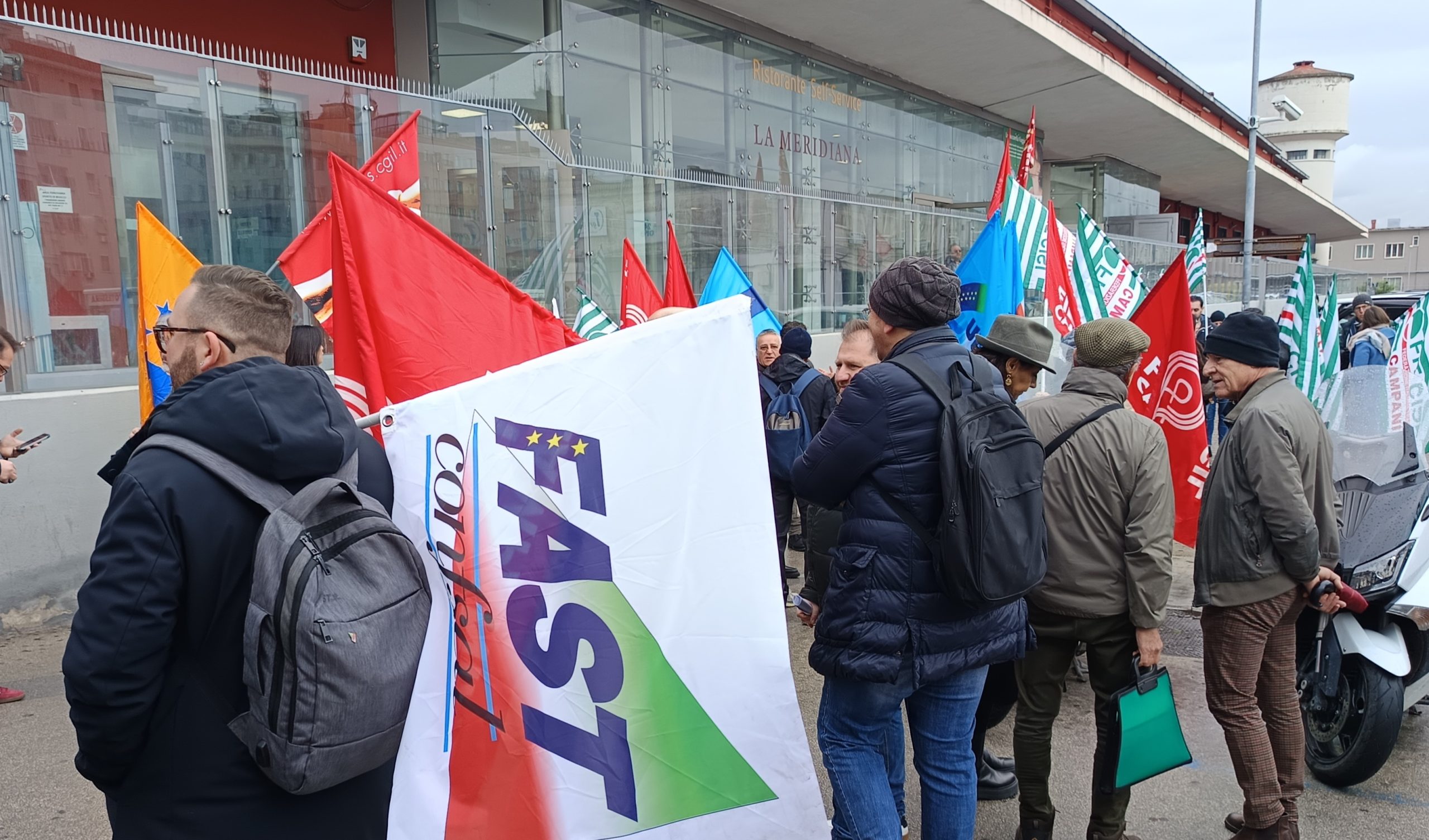 Nutrito e variegato presidio contro la chiusura della mensa ferroviaria di Napoli Centrale. Lo stop definitivo è fissato per il prossimo 28 febbraio.