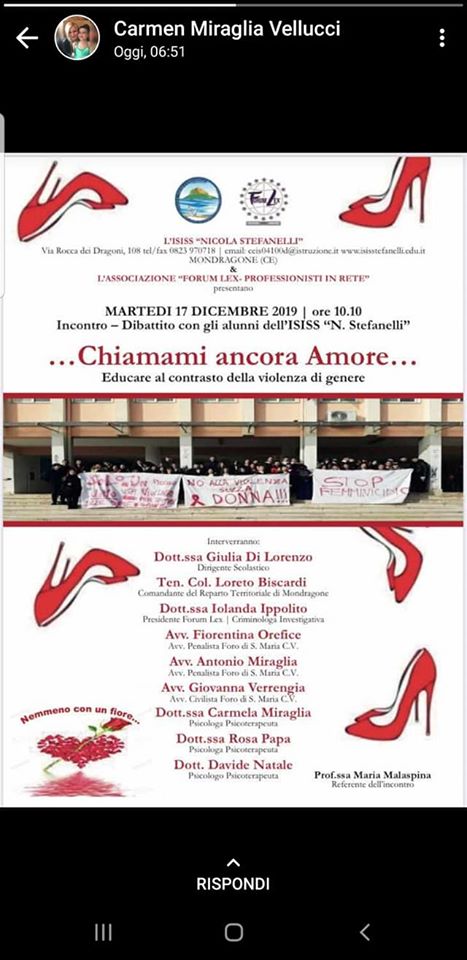 Mondragone. Grande successo dell’evento “….Chiamami ancora Amore”- Educare al contrasto della violenza di genere” che si e’ tenuto ieri mattina, 17 dicembre 2019, a partire dalle ore 10.00, presso l‘ISISS ” N.Stefanelli” di cui e’ Dirigente Scolastico la Prof.ssa Giulia Di Lorenzo.