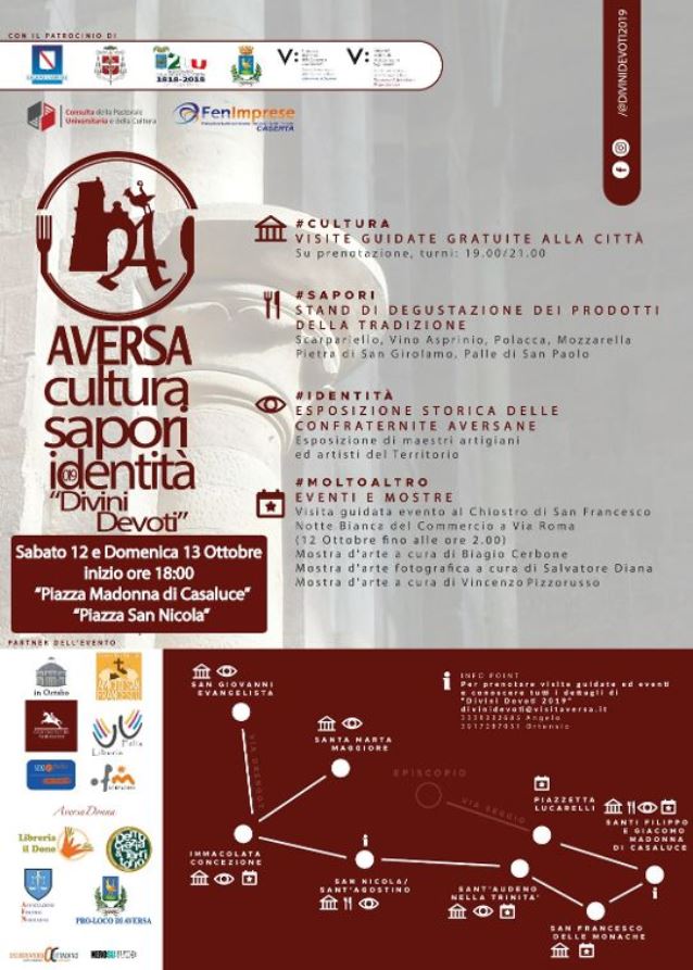 Mercoledì, 9 ottobre 2019, si è tenuta la conferenza stampa di “Aversa. Cultura, Sapori, Identità - Divini Devoti” presso la Curia diocesana di Aversa per illustrare i dettagli della manifestazione in programma per sabato 12 e domenica 13 Ottobre 2019.