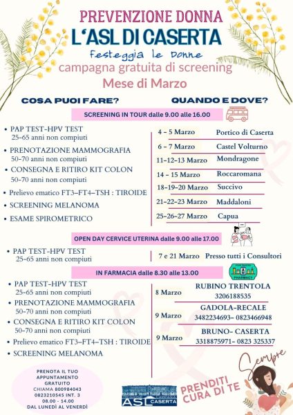 Aderisci alla campagna gratuita di screening messi a disposizione dall’ASL Caserta che festeggia le donne ampliando, nel mese di marzo, le opportunità di fare prevenzione.