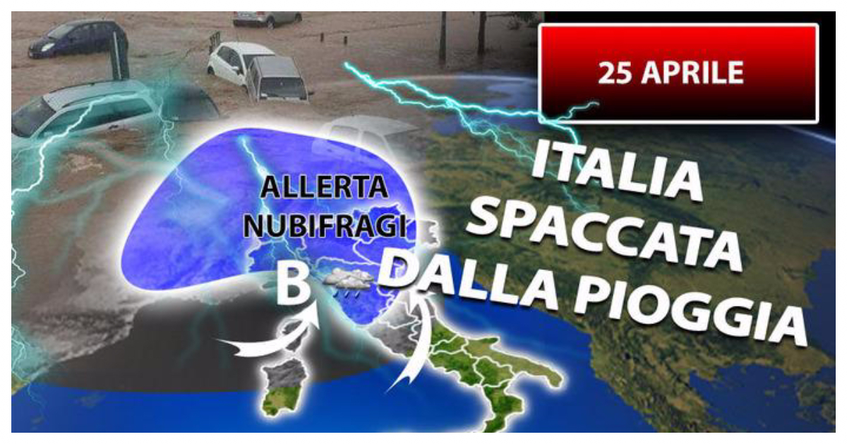 I metereologi ci avvertono che domani 25 Aprile assisteremo a un’Italia che sarà letteralmente spaccata in due tra sole e nubifragi: al sud sarà l’intenso avremo SOLE ad avere la meglio, al nord invece un’ALLERTA NUBIFRAGI e temporali.