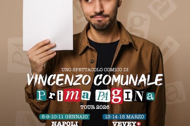 Dopo l’ennesimo successo televisivo nell’edizione “Zelig On” in prima serata su Italia 1, che lo conferma unico comico napoletano nel cast dell’olimpo delle comedy show nazionali, Vincenzo Comunale torna a calcare i palcoscenici con un nuovo spettacolo, scritto e diretto dallo stesso Comunale, che si intitola “PRIMA PAGINA” e sarà in tour a partire da Gennaio 2026 con debutto a Napoli presso il Teatro Acacia dall’8 all’11 gennaio. Inizio ore 21. Biglietti: Platea euro 25+d.p. Galleria euro 20+d.p. Prevendita attiva al seguente link