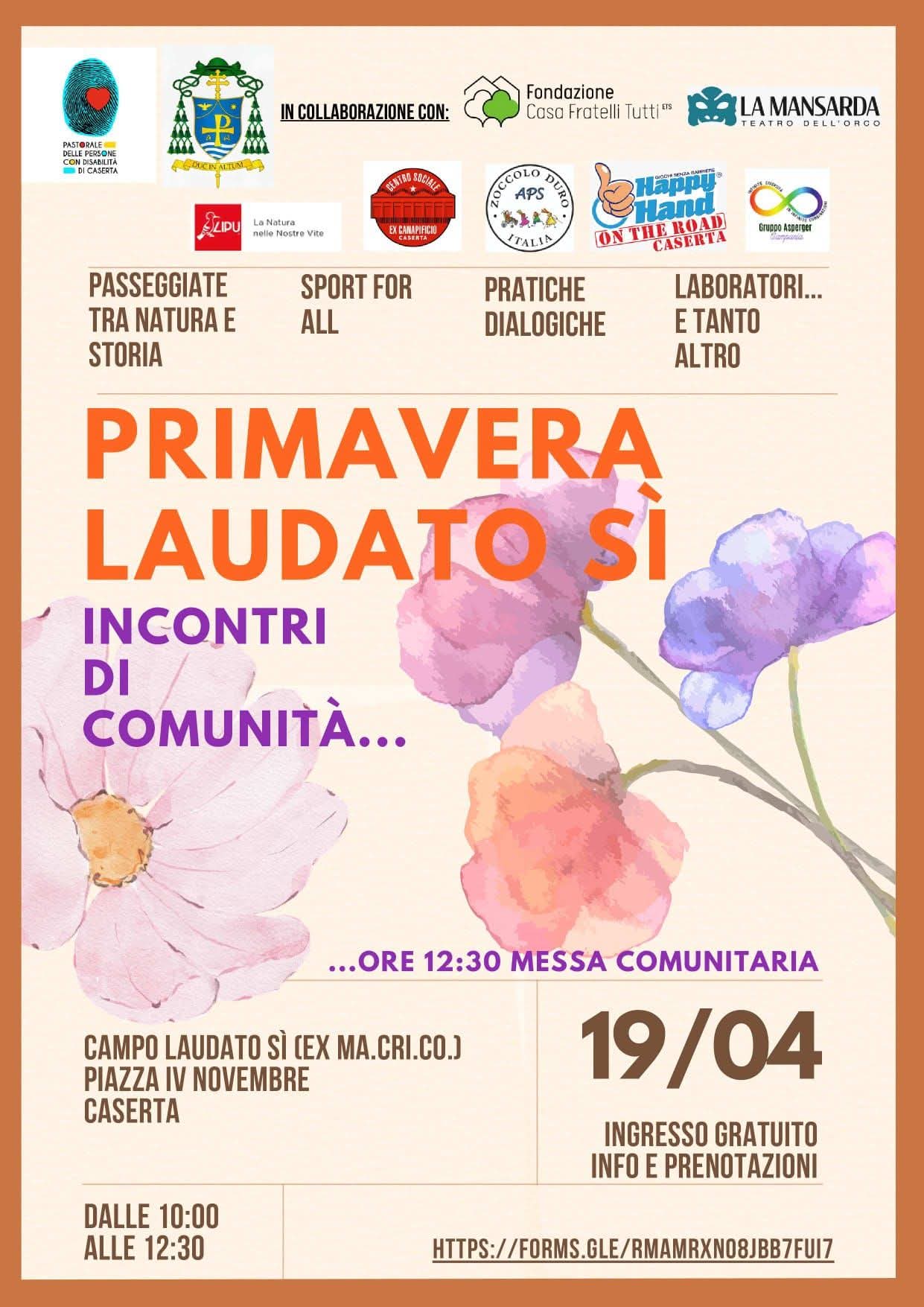 La pastorale delle persone con disabilità della diocesi di Caserta con la collaborazione della fondazione Casa Fratelli Tutti, de La Mansarda, del gruppo asperger Campania( sez. Caserta) , ed altre associazioni come Happy hand, la Lipu, il Centro sociale ex canapificio. ha organizzato per domenica 19 aprile una giornata di primavera al campo Laudato si, dalle 10:00 alle 12:30. Lo scopo della iniziativa è quello di vivere una mattinata abitando il campo ex Macrico, con tutti quei cittadini che desiderano vivere un momento di accoglienza reciproca e inclusione nella natura.