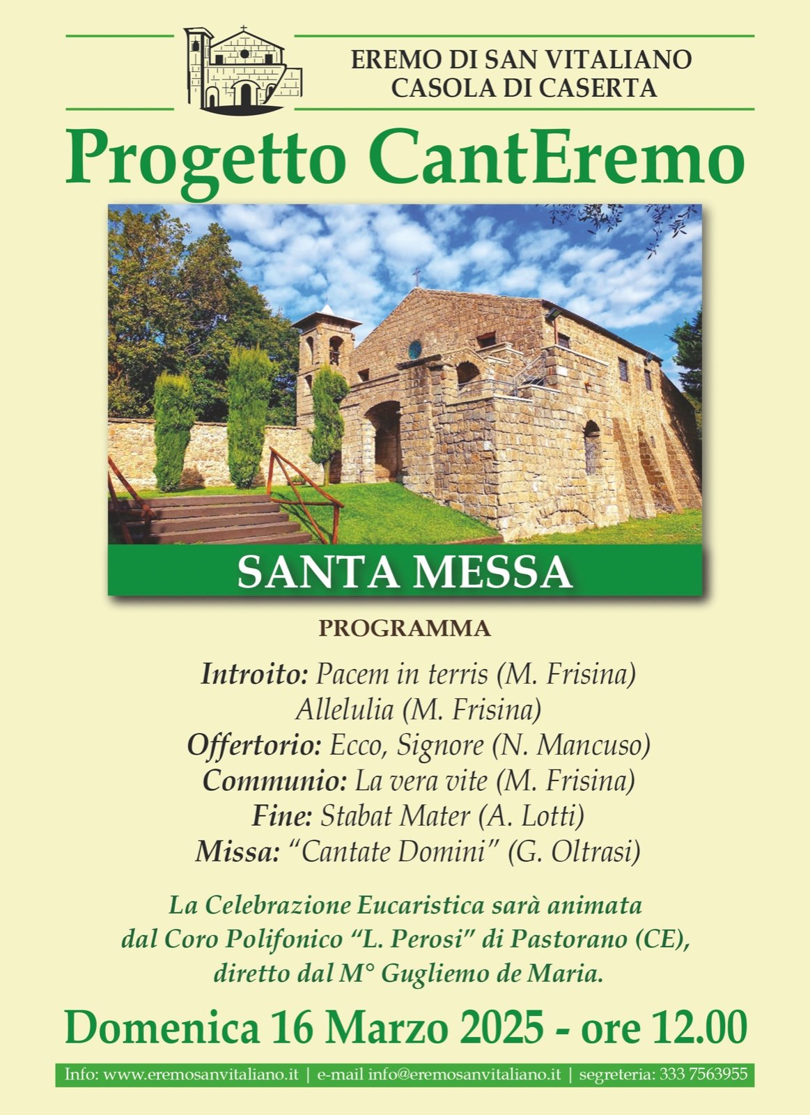Proseguendo nel progetto Canteremo 2025, bellissima iniziativa messa in campo, da Don Valentino Picazio presso l’Eremo di san Vitaliano di Casola. Domenica 16 marzo, all’Eremo, durante la santa messa il coro polifonico di Pastorano, “L. Perosi” diretto dal maestro Guglielmo de Maria eseguirà una serie di brani al fine di animare la santa messa. Verranno eseguiti i seguenti brani: Pace in terris, La vera vite e alleluia di Marco Frisina, Ecco, Signore di Nino Mancuso, lo stabat Mater di Antonio Lotti, la Cantate Domini di Giuseppe Oltrasi. La cerimonia religiosa e canora si terra domenica 16 marzo alle ore 12.00 nello splendido scenario dell’Eremo di San Vitaliano.