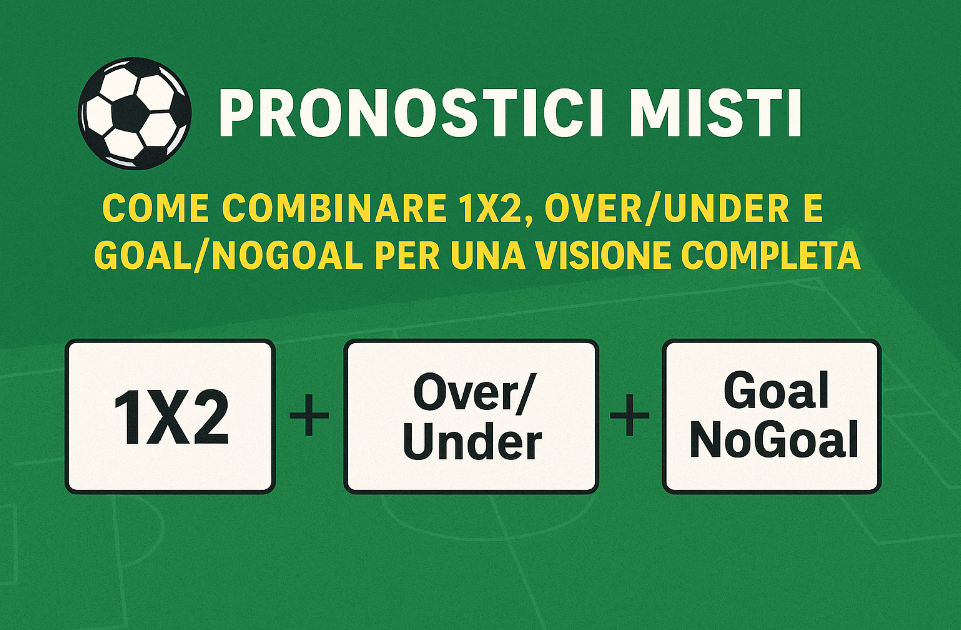Un pronostico misto nasce dalla combinazione di due o più esiti diversi sulla stessa partita. Il concetto base è semplice: invece di limitarsi a dire “vince la squadra di casa” (esito 1), si può combinare con un altro dato, ad esempio “ci saranno almeno due gol nella partita” (Over 1.5), oppure “entrambe le squadre segneranno” (Goal). Il risultato sarà un pronostico tipo 1 + Over 1.5, oppure X2 + Goal, o ancora 1X + Under 3.5.