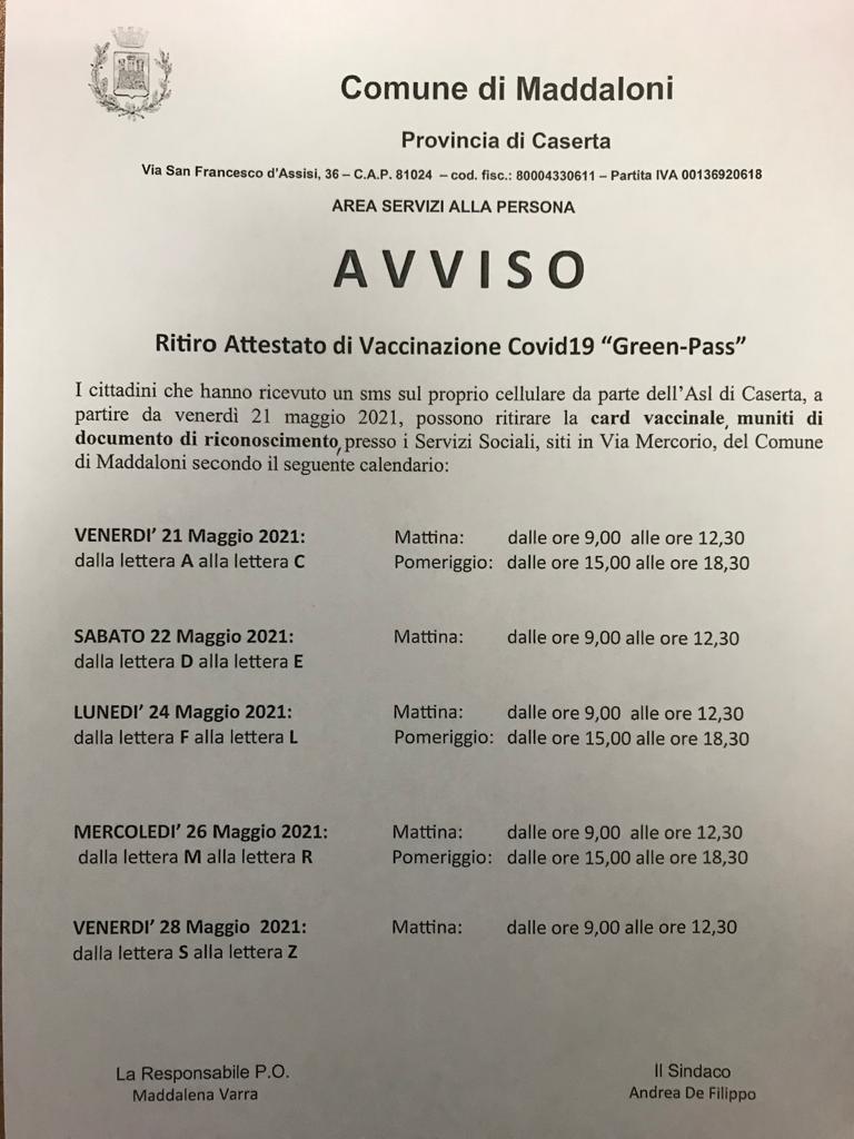 Il Comune di Maddaloni annuncia la distribuzione di card vaccinali , specificatamente “Green – Pass” per coloro che risultano censiti dall’ Asl. L’ elenco dei vaccinati e le relative comunicazioni sono curate direttamente L’ Asl. Coloro che riceveranno un sms dall’ Asl, dovranno recarsi presso i servizi sociali di via Mercorio del Comune di Maddaloni per il ritiro della card secondo il calendario pubblicato dal Comune di Maddaloni. La consegna, sempre previa ricezione del sms da parte dell Asl, inizierà il 21 Maggio presso i servizi sociali del Comune di Maddaloni. Il calendario stilato dal comune è inoltre pubblicato sul sito www.comune.maddaloni.ce.it