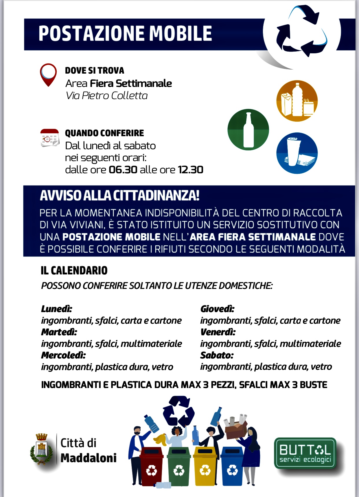 In attesa dell’adeguamento della riapertura dell’isola ecologica di via Viviani a Maddaloni, il Comune di maddaloni in concerto con la Buttol e individuato una nuova area per il conferimento dei rifiuti. Quest’area che sarà utilizzata temporaneamente si trova in via Pietro colletta nei pressi dell’area della fiera settimanale.per il conferimento di rifiuti gli orari e il calendario sono di seguito riportati.