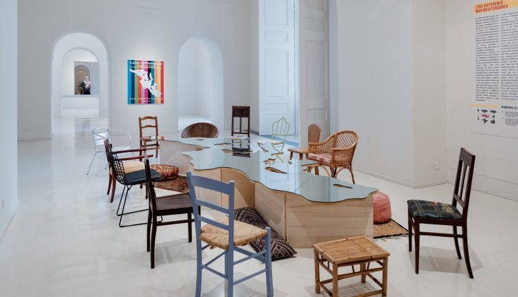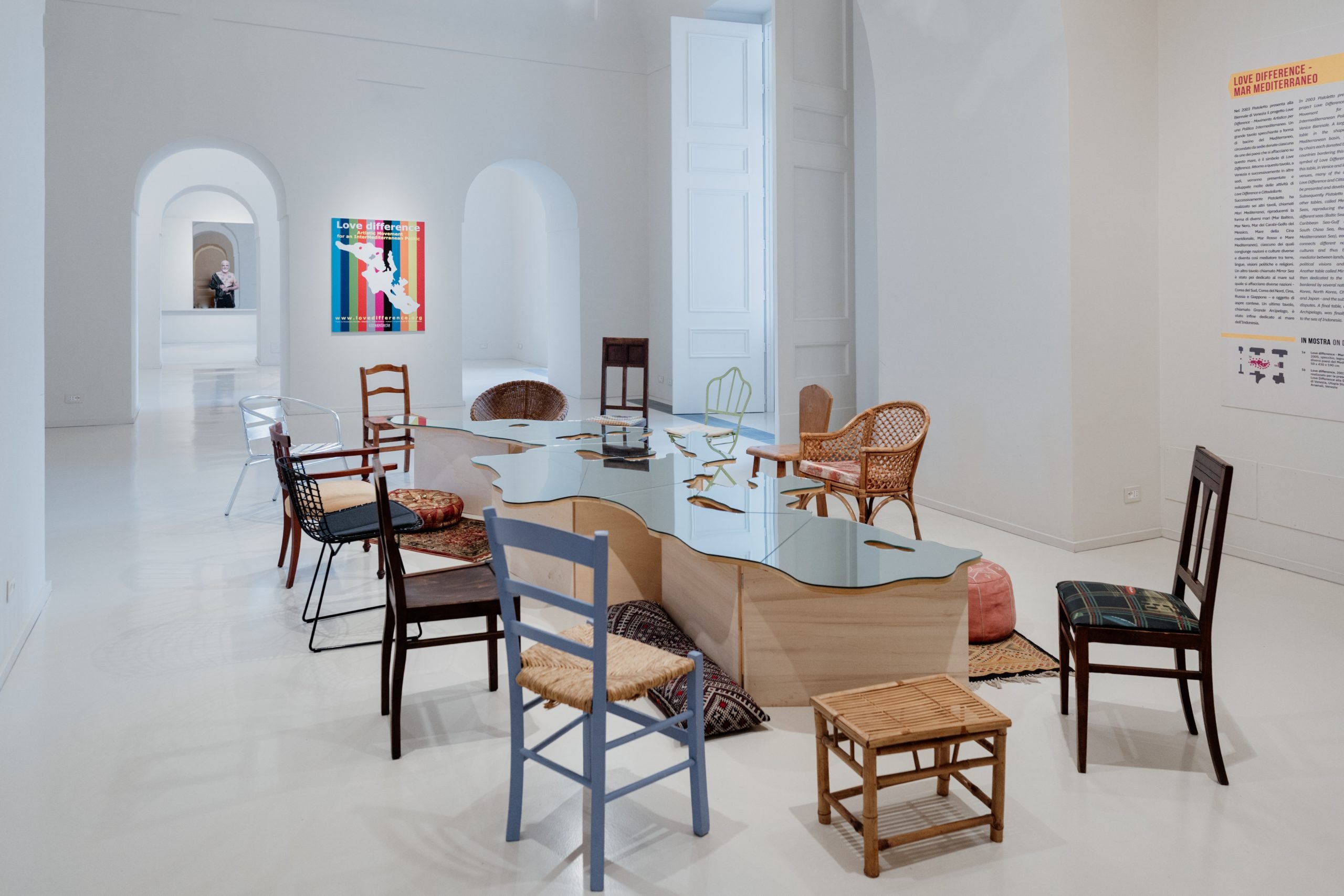 L’arte di Michelangelo Pistoletto è aperta al dialogo e allo scambio. È una ricerca in continua evoluzione ed espansione intesa a ripristinare il contatto tra l’esperienza artistica e il mondo esterno. Emblema della mostra è l’opera “Love difference – Mar Mediterraneo”, un grande tavolo specchiante a forma di bacino del Mediterraneo, circondato da sedie donate ciascuna da uno dei Paesi che si affacciano su questo mare. Il Mediterraneo congiunge nazioni e culture diverse e diventa mediatore tra terre, lingue, visioni politiche e religioni, nella consapevolezza che tutte custodiscono un patrimonio culturale comune e possono essere generatrici di un progetto collettivo condiviso.