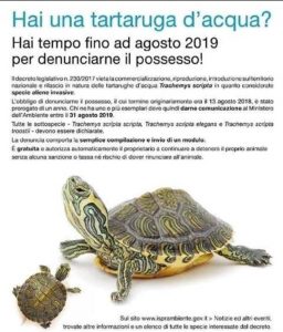 I possessori di questi animali dovevano inizialmente regolarizzare la propria posizione denunciando il possesso degli esemplari al Ministero dell’Ambiente entro il 13 agosto. Il termine per la denuncia del possesso delle specie alloctone invasive è stato invece prorogato al 31 agosto 2019. Vi ricordiamo che la denuncia di possesso di uno o più esemplari di Trachemys scripta attraverso il modulo allegato va inoltrata al Ministero dell’Ambiente attraverso: