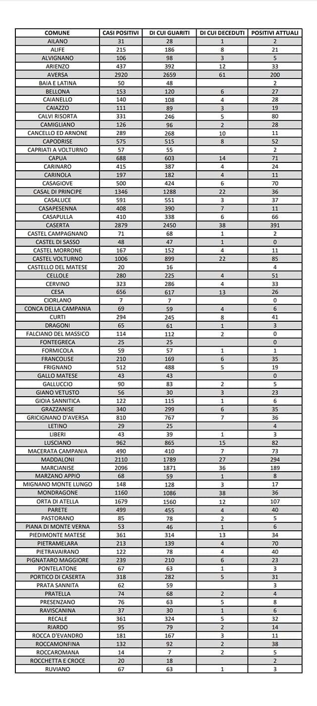 Provincia di Caserta- Pubblichiamo il resoconto del numero del numero di positivi, dei guariti, dei deceduti e degli attuali positivi comune per comune. Ad Aversa si registrano 2920 positivi, di cui guariti 2659, 61 deceduti e 200 attuali positivi. A Capua 688 positivi,di cui 603 guariti, 14 deceduti e 71 attuali positivi. A Caserta 2879 positivi, di cui 2450 guariti, 38 deceduti e 391 attuali positivi. A Maddaloni 2110, di cui 1798 guariti, 27 deceduti e 294 attualmente positivi