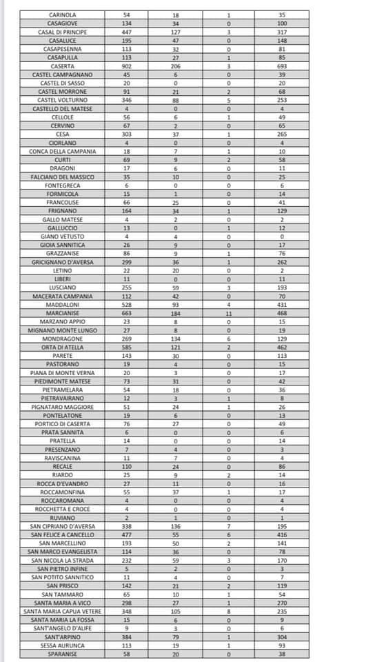 Provincia di Caserta/ pubblichiamo tutti i dati forniti dall’ASL sui nuovi contagi, sui numeri complessivi e sulla curva epidemiologica. La provincia di Caserta registra ben 13402 positivi (vanno sottratti i guariti). Aversa registra 1096 casi, confermandosi tra le più colpite.