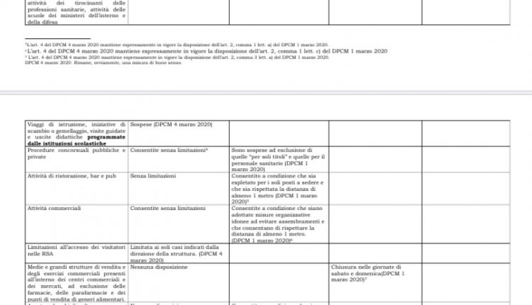 Quadro sinottico dei divieti in vigore (DPCM 4 marzo 2020)