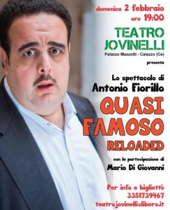 CAIAZZO – Continua la stagione 2019/2020 al Teatro Jovinelli di Caiazzo. Il cartellone allestito dal maestro Franco Mantovanelli e dal direttore artistico Enzo Varone prevede, come quinta proposta, lo spettacolo ‘Quasi Famoso’ di Antonio Fiorillo, che sarà in scena sul palco di Palazzo Mazziotti domenica 2 febbraio 2020 con inizio alle ore 19:00.