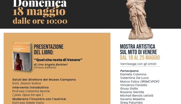 Domenica 18 maggio, a partire dalle ore 10, il Museo Campano di Capua (via Roma, 68) ospiterà un evento culturale di grande fascino: la presentazione del romanzo “Quel che resta di Venere” di Lina Angela Barbieri (Graus Editore), accompagnata da una mostra d’arte collettiva ispirata alla figura della dea dell’amore e della bellezza. L’ingresso è gratuito per i partecipanti alla kermesse.