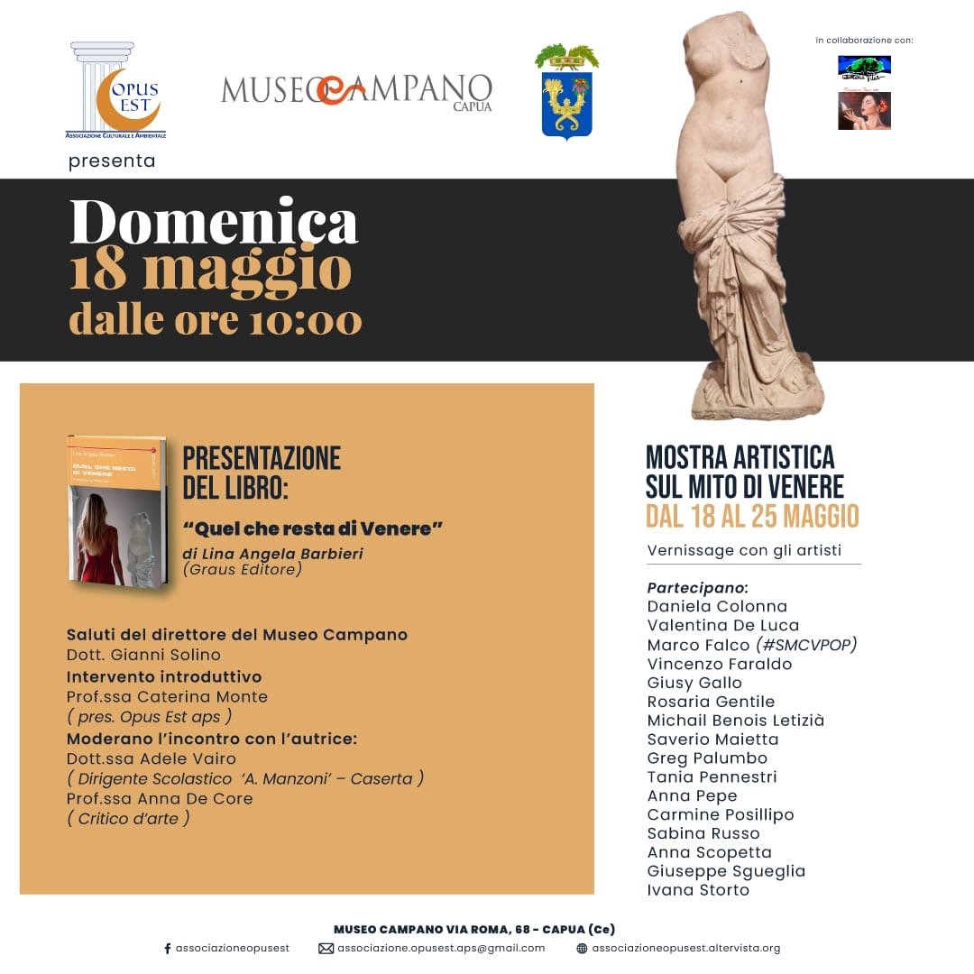 Intervengono alla presentazione: Dott. Gianni Solino, direttore del Museo Campano, per i saluti istituzionali, la Prof.ssa Caterina Monte, presidente di Opus Est aps, per l’intervento introduttivo all’evento e moderano il dibattito con l’autrice l’Avv. Lina Angela Barbieri, la Prof.ssa Adele Vairo, dirigente scolastico del Liceo “Alessandro Manzoni” di Caserta e la critica d’arte Prof.ssa Anna De Core. Alla fine della presentazione del volume si terrà il vernissage della mostra d’arte ‘Il mito di Venere’ che il Museo Campano ospiterà appunto dal 18 maggio fino al 25. Sarà una esposizione collettiva dedicata al mito di Venere reinterpretato da 15 artisti contemporanei del territorio, tra classicismo, avanguardia, digitale e pop art. Espongono Daniela Colonna, Valentina De Luca, Marco Falco (#SMCVPOP), Vincenzo Faraldo, Giusy Gallo, Rosaria Gentile, Michail Benois Letizià, Saverio Maietta, Greg Palumbo, Tania Pennestrì, Anna Pepe, Carmine Posillipo, Sabina Russo, Anna Scopetta, Giuseppe Sgueglia ed Ivana Storto. A latere del vernissage ci sarà un breve evento rievocativo dedicato a Venere, presso la sala dedicata al tempio di Diana Tifatina – che ospita una statua mutila di Venere – a cura del Dott. Ivan La Cioppa, Marco Falco (Ancient Capua Experience) e la Prof.ssa Pina Noviello (ArcheoClub Pompei/LegioIAdiutrix)
