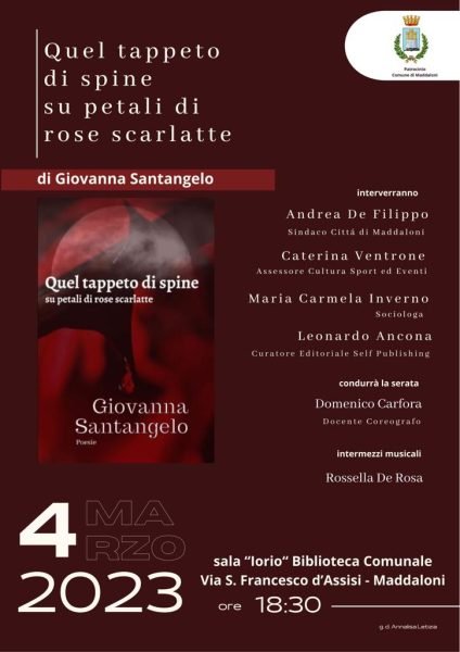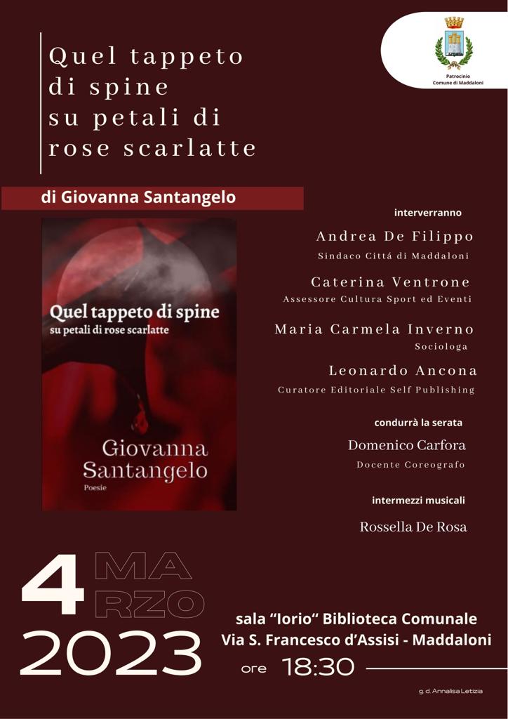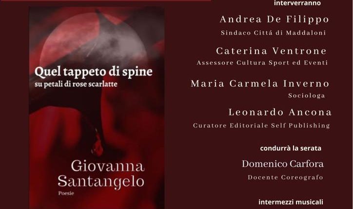 Il 4 marzo, con il patrocinio del comune di Maddaloni e con la presenza del sindaco Andrea De Filippo e dell’assessore alla cultura sport ed eventi Caterina Ventrone, Domenico Carfora modererà la presentazione di “Quel tappeto di spine su petali di rose scarlatte.”. Interverranno la sociologa Maria Carmela Inverno e il curatore editoriale Leonardo Ancona. Rossella Di Rosa curerà gli interventi musicali nel corso della serata.
