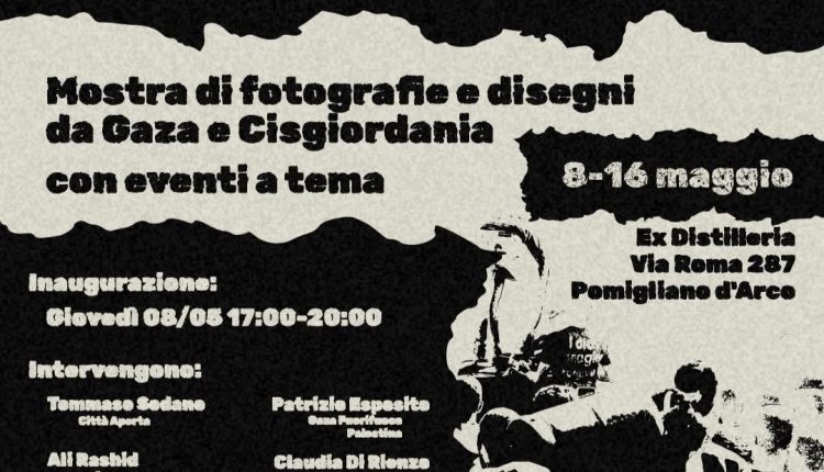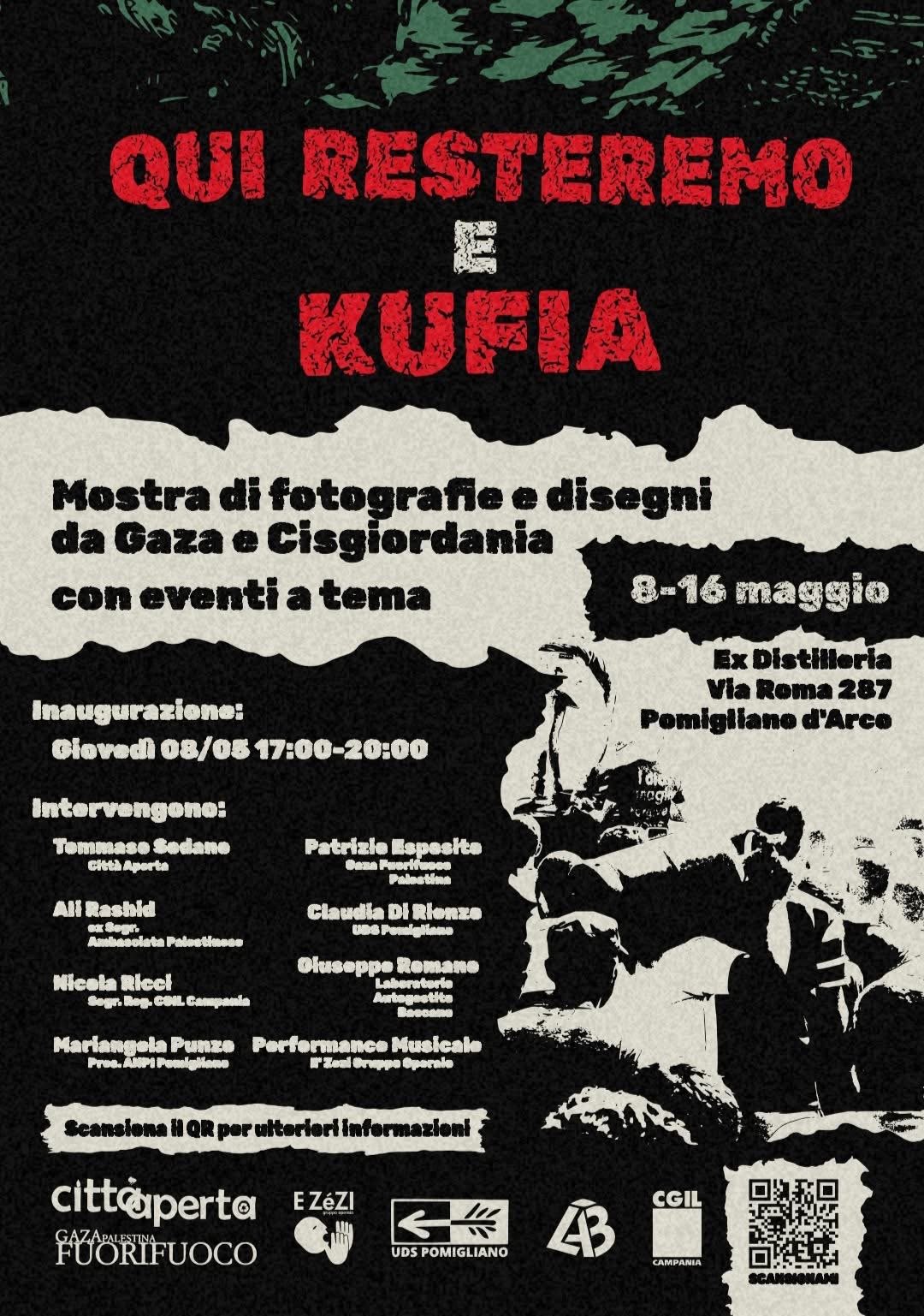 Nel mese di maggio 2025, la città di Pomigliano D’Arco accoglierà la mostra Qui resteremo, fotografie da Gaza e Cisgiordania, e Kufia, matite italiane per la Palestina, allestite negli spazi della Sala Convegni ex Distilleria, Via Roma 287.